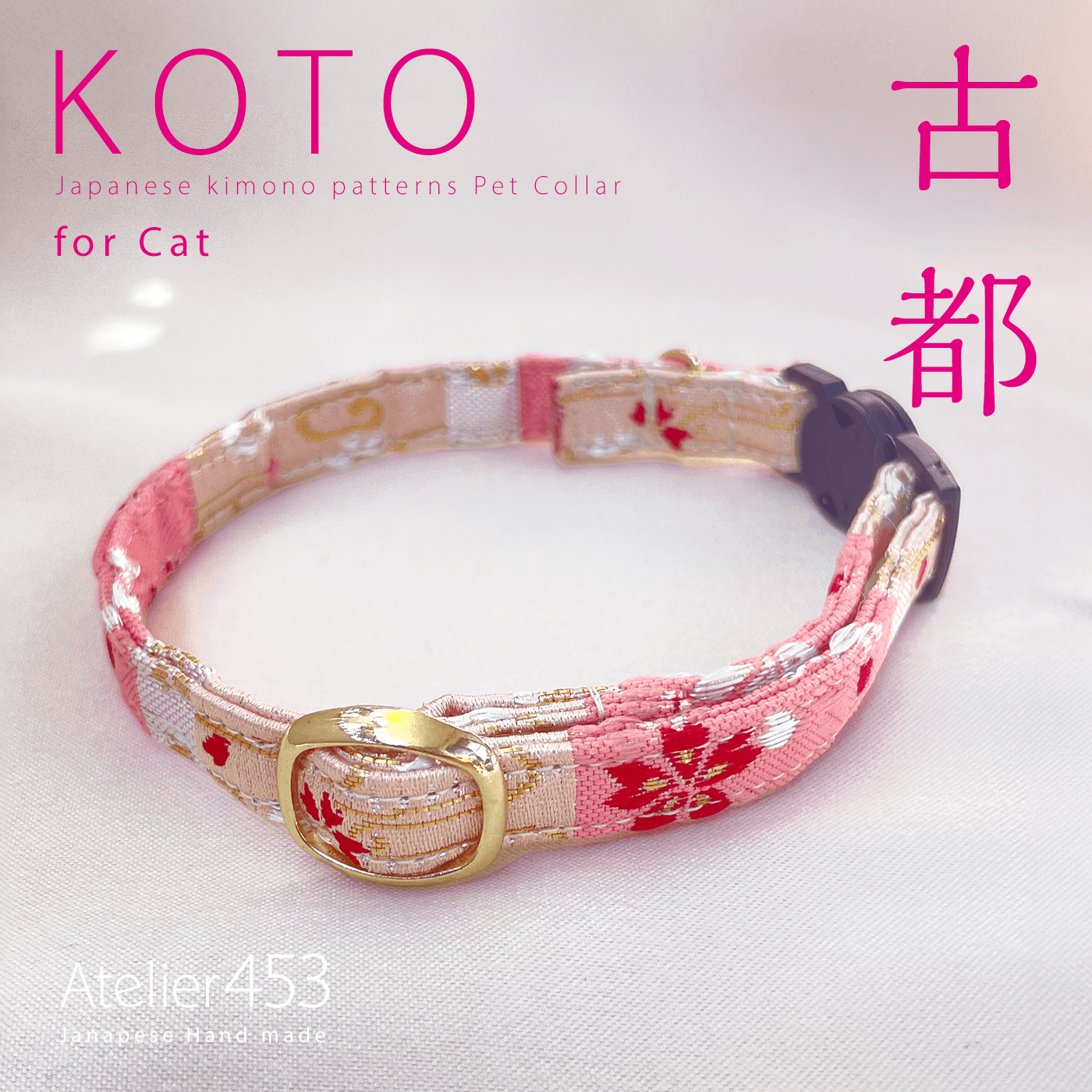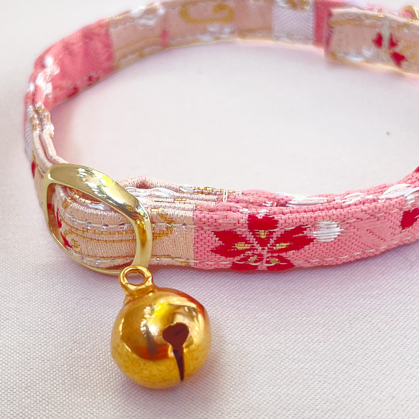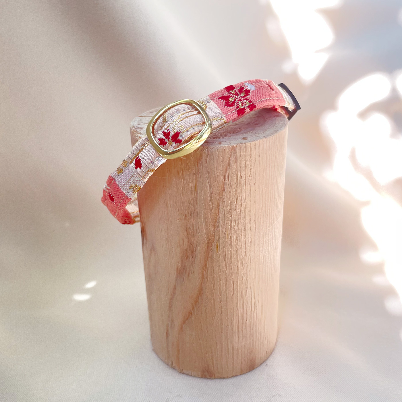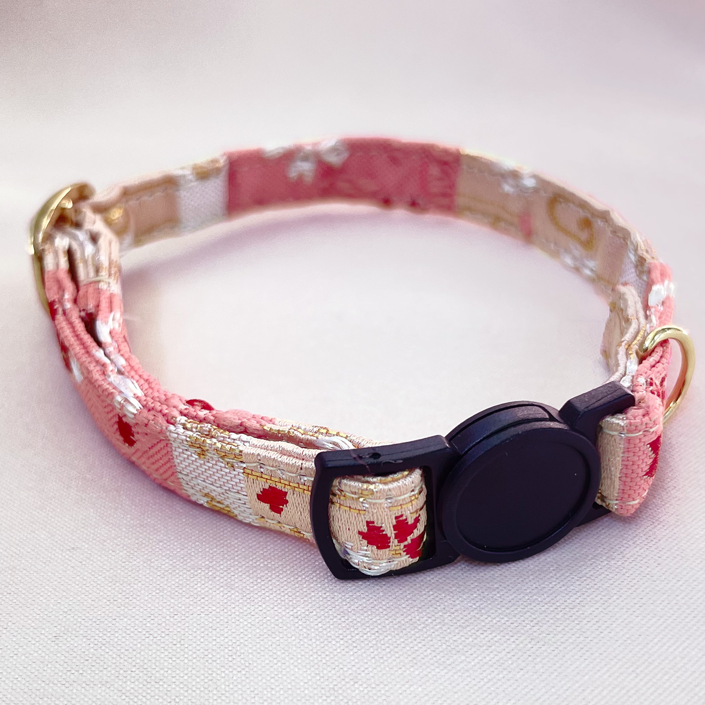 製品イメージのピンクの首輪は観世流水と桜の伝統柄です。