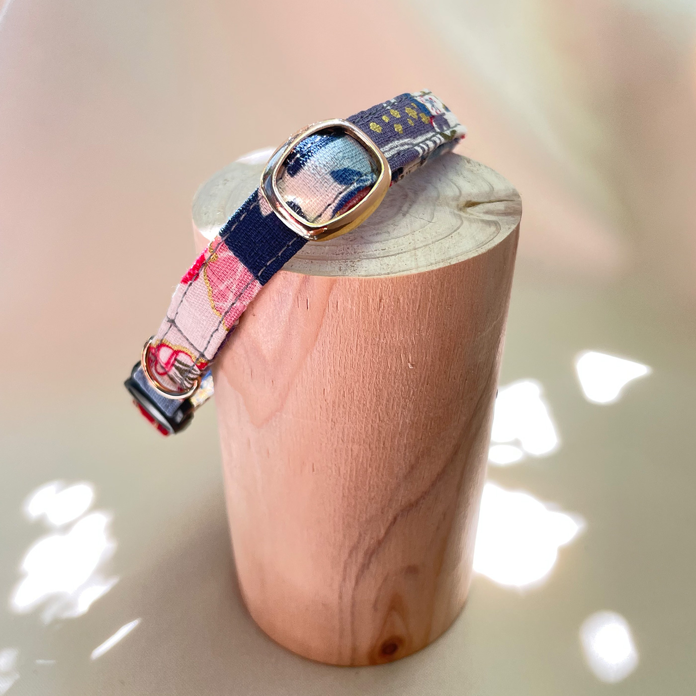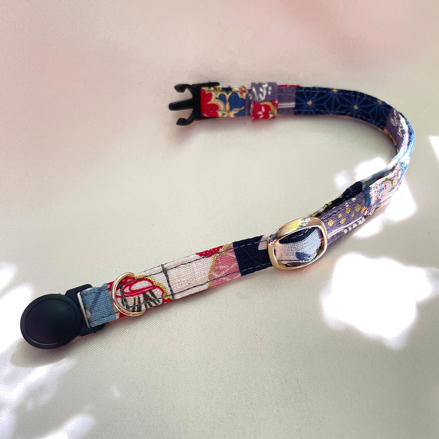 ネコちゃん用の首輪にはセーフティーバックルを使用しています。ある程度の力がかかると自動的にバックルが外れる仕様となっています。