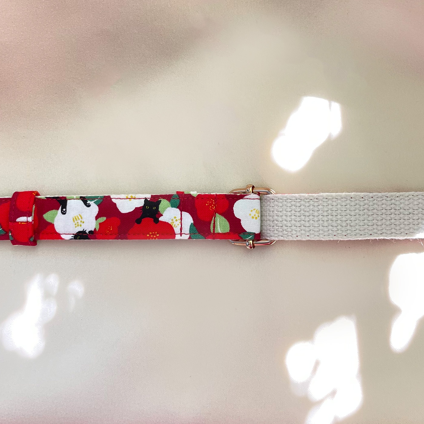 ネコちゃん用の首輪にはセーフティーバックルを使用しています。ある程度の力がかかると自動的にバックルが外れる仕様となっています。